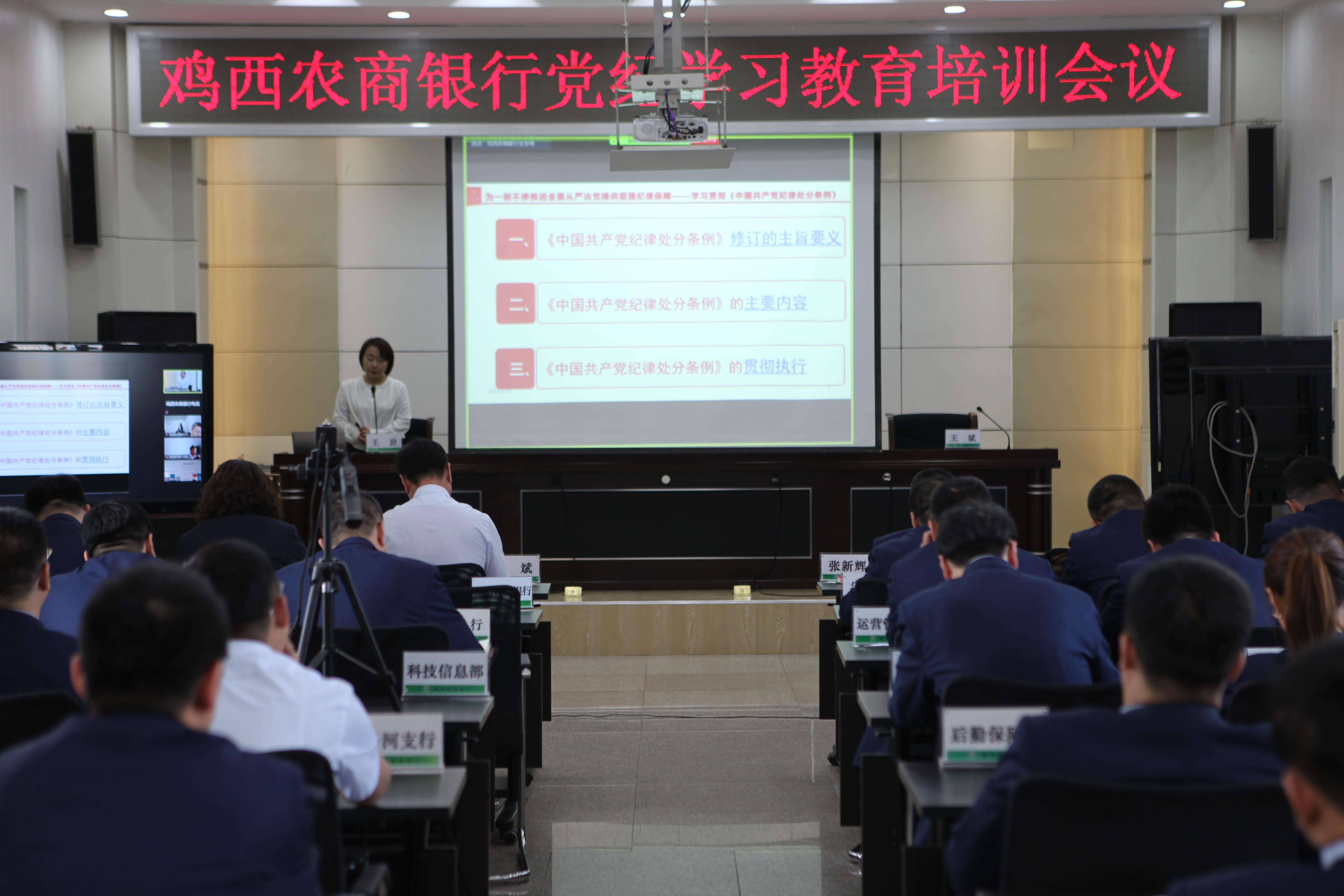 5月23日,鸡西农商银行召开党纪学习教育培训会议。鸡西农商银行领导班子、机关党员、基层党支部书记及党员共计140余人参加培训。