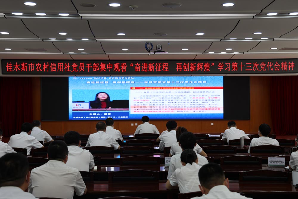 为深入学习贯彻省第十三次党代会精神,5月23日,佳木斯市农村信用社党员干部集中收看了“龙江讲坛”第 735期暨“省直机关学习讲坛”第 31 讲“学习贯彻省第十三次党代会精神”专题讲座,黑龙江省委党校(黑龙江省行政学院)副校(院)长、二级教授梁謇作题为“奋进新征程 再创新辉煌——学习贯彻省第十三次党代会精神”的宣讲。市联社党委班子成员,市联社各部室负责人及郊区联社党员干部集中收看了专题讲座,各县级行社也采取多种方式组织党员干部收看,参看受益人数共计550余人。