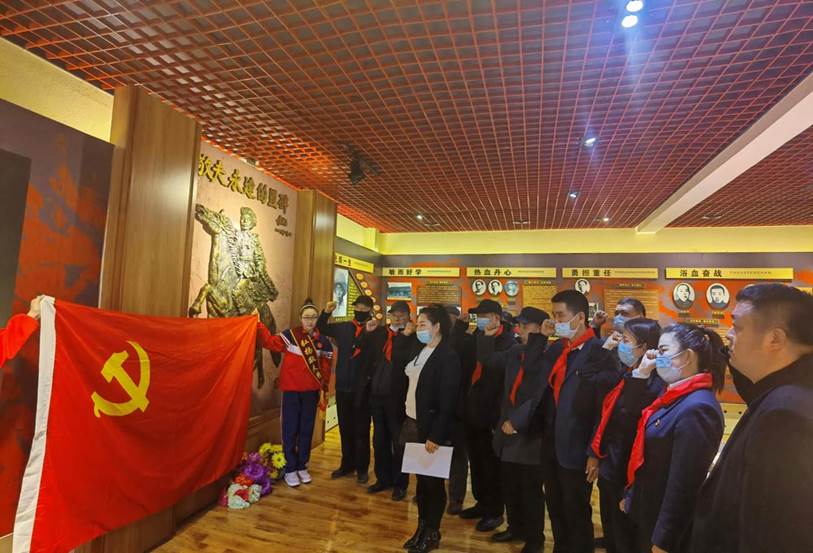 捐赠仪式后,一行人来到县敬夫小学烈士纪念馆,小解说员详细地解说了敬夫小学校名的由来和赵敬夫(原名白长岭)的一生。参加活动所有人重温入党誓词,面对火红的党旗,重温铿锵的誓言,革命精神在这一刻得到新的洗礼,党员思想得到新的提升。此次参观烈士纪念馆使党员们的心灵受到了一次净化,对英雄的崇敬之情油然而生,激发了强烈的爱国主义和集体主义精神。