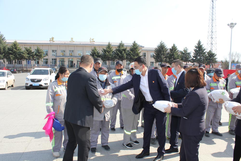 为充分履行社会责任,践行初心使命,切实解决垦区群众最关心、最直接、最现实的利益问题。2021年4月26日,建三江农商银行党委副书记、行长李景发,党委委员、监事长张宇,党委委员、副行长李元成带领总行机关党支部党员干部组成慰问小组到盛源社区慰问一线环卫工人。